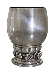 Weinbecher, GEORG JENSEN aus der Collection: THE GRAPE COLLECTION, Silber 925/000, sig. DENMARK GEORG JENSEN STERLING Modell 296 A, Entwurf um 1928, getriebener Dekor, abgetreppter Fuß mit stilisiertem Weintraubendekor, Kelch mit Hammerschlag, H = 89,2 mm, D = 72,5 mm, total 123,4 g, schöner Zustand !