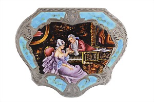 powder compact, Italy early 20th century, silver 800/000, inside gold plated with mirror, cover with amorous scene from the 18th century, colored enamel, the powder compact is all-around elaborate engraved, size c. 98.0 x 70.0 mm, height = c. 10.0 mm, box is in very good condition!