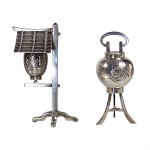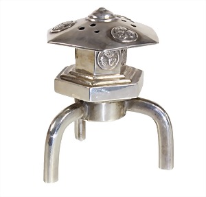 two spice shakers (pepper), Asia, (JAPAN/CHINA ?), both hallmarked: STERLING, 1 shaker: kettle on a tripod, height = c. 79.0 mm, first half of the 20th century, 1 shaker: modelled garden lantern on a stand around 1900/20, height = c. 87.0 mm, total 33.4 g