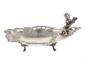 bowl late 19th century, silver 800/000, signed, textured flowers, edge with pierced worked leafage, surface was fine re chased, 4 curved feet, at the end of the bowl sits an putto that plays the harp, plastic worked, with a scarf loosely over the legs, size c. 32.5 x 21.0 cm, height = 13.5 cm, total 598.0 g, with a a dedication on the bottom: "Zur freundl. Erinnerung an Maria Zanders Berg. Gladbachb 1897." the bowl with dedication (on the reverse) was a gift by the well-known entrepreneur Maria Zanders to one of her godfathers, in 1969 his wife bequeathed this silver object to a caregiver in the Heidelberger area, Maria Zanders was the wife of the paper manufacturer Carl Richard Zanders from Berg. Gladbach and after his death from 1870 on she run the company, it was considered that she was a patron of the arts, and was visited by important artists, for more informations about it and the "women at Zanders" please check the homepage of the Stiftung Zanders. Attached is an original newspaper article about Mrs. Zanders from the year 1935