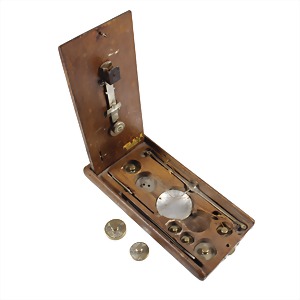 Apotheker/Goldschmiedewaage bis 30 g, 1940/50er Jahre, Holzetui mit Gramm Gewichten und Pinzette, ungep.