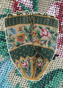 glass beads-bag, late Biedermeier period around 1850/70, frieze made of multicolored flowers and leaves, height = c. 23.0 cm (without handles), nice condition !