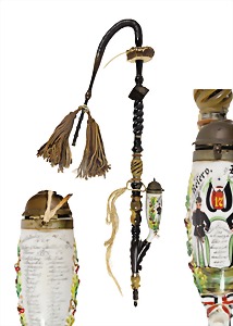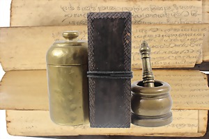 lot: Nepal/Tibet, 1 tea box with cover, first half of the 20th century, height = c. 12.0 cm, diameter = 68.5 mm, 1 mortar, both in bronze, 1 holy book