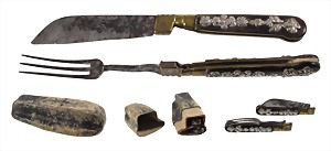 Reisebesteck aus dem Barock, wohl Frankreich um 1750/80, Messer u. Gabel einklappbar, Holzgriffe mit Silberapplikationen verziert, L = ca. 15,0 cm, Originalschatulle aus Papier, beidseitig mit einer Lilie verziert