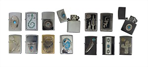 lot, 14 VINTAGE fuel cigarette lighters, Zippo USA, sundry Amerindian motifs, cactus, howling wolf, feather, snake ..., unchecked!