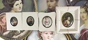 Lot: 4 Miniaturmalereien (1 x auf Stoff), Bein, 1 großer Rahmen: Lady Hamilton, mit Intarsien ausgelegt ca. 14,0 x 15,8 cm