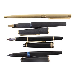 Lot Schreibutensilien: MONT BLANC, 1 Dreh-Kuli, goldfarben, L = 14,0 cm; 1 Kolbenfüllhalter (220) 1970er Jahre (mattschwarz) mit Goldfeder 585/000, L = 13,5 cm, 1 Füller (schwarzes Gehäuse) MEISTERSTÜCK mit Goldfeder WG/GG 585/000 (4810), L = 13,7 cm; 1 Füller 31 (schwarzes Gehäuse), L = 12,7 cm, ungep.!