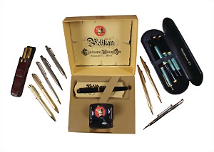 lot writing things: 1 PELIKAN piston fountain pen (M) with inkpot (4001 royal blue) and original casket, 2 PELIKAN piston fountain pens with gold nib 585/000 (14 C), 2 PELIKAN ballpoint pens, 1 pen and 1 pencil from the ROWENTA, in leather case, 2 retractable ballpoint pens by CROSS (14 ct ROLLED GOLD, 1 WATERMAN and others, not tested!