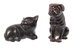 2 Netzukes, Japan 1.Hälfte 20.Jhd., Holz, 1 Hund, H = 49,0 mm; 1 Schwein, L = ca. 46,0 mm