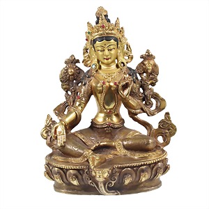 green Tara 20th century, Tibet/Nepalese deity, metal/copper ? gilded, painted face, set with colored stones, height = c. 14.8 cm, total 615 g