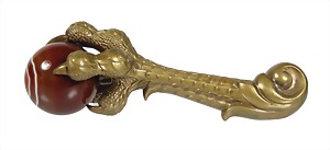 Briefbeschwerer, IDAR-OBERSTEIN um 1880, Metall gelbfarben, 4 Vogelklauen halten eine gebänderte Achatkugel, D = 37,0 mm, L = 14,0 cm, zu finden im Schmuckmuseum IDAR-OBERSTEIN !