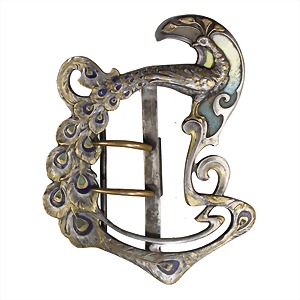 belt buckle, art nouveau, France around 1900, metal white (tombac) and yellow, peacock with expanding plumage, partially decorated with matt enamel, c. 72.0 x 88.7 mm, harmonious expression !