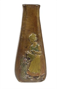 Kleine Vase, Wiener Bronze um 1900, Blumen gießende Frau in nordischer Tracht, an den Füßen ein Paar Holzpantoffeln, Rückseite mit Sträuchern u. Bäumen dekoriert, H = 11,0 mm, schöne Patina !