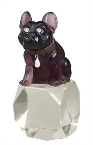paperweight, ART-DECO 1920/'30s, sitting mastiff on a polished glass base, three-dimensional body made of satinized purple-colored glass, around the neck a metal string with a drop shaped pearl, height = 11.6 cm