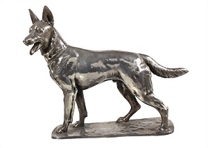 SCHÄFERHUND auf Sockel, WMF, Design: FRITZ DILLER 1875-1946, sig. WMF l/O H (versilbert), B = 17,0 cm, H = 15,0 cm, vollplastisch ausgearbeitet, schöne Patina !