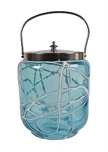 Keksdose, JUGENDSTIL um 1900, wohl PALME & KÖNIG, Metall weiß, über die gesamte Wandung laufen unregelmäßige weiße Fäden (typisches Merkmal der Fa. Pallme & König), transparentes Glas mit partiell blauer Einfärbung, Deckel u. beweglicher Henkel, H = 22,5 cm, D = 13,5 cm