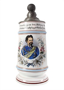 Reservistenkrug um 1900, Porzellan, farbig bemalt, zentrales Bild von Ludwig II, Inschrift: Zur Erinnerung an den Feldzug 1870/71 gegeben v. Veteranen-& Krieger-Verein Pasing 7.7.1901. Ausgefallener als Helm gestalteter Deckel, im Hintergrund der Landes-Löwe, D = ca. 11,5 cm, H = 27,5 cm, im Boden durchscheinende Stubenszene.