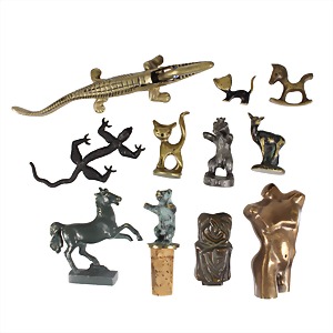 lot: 11 items made of bronze/brass, among others 1 male torso, height = 88.7 mm, 1 little cat, (Walter Bosse ?), 1 horse, 1 crocodile as nutcracker, length = c. 17.5 cm, bottle stopper, bear with inscription: BERLIN, among others