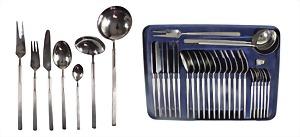 modern 27-piece cutlery, COPENHAGEN CUTLERY DENMARK by Erik Herlow (signed USC), stainless steel, always 6 knives, forks, spoons and coffe spoons, and 1 sauce spoon, 1 serving spoon and 1 meat fork, length = 14.2-24.7 cm, original casket !