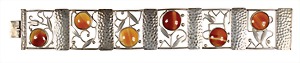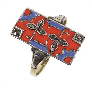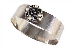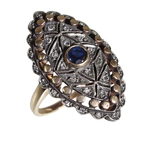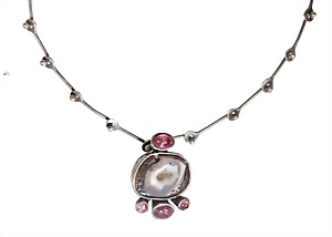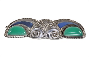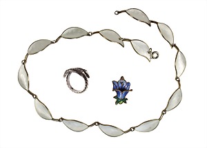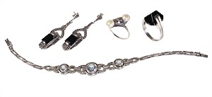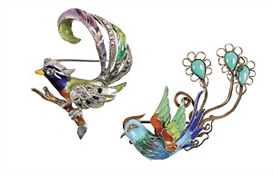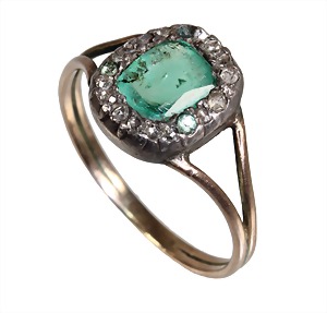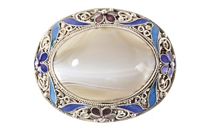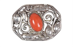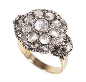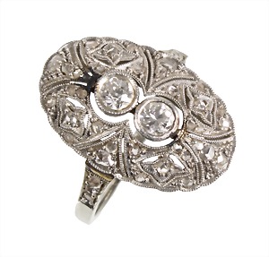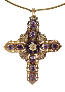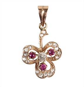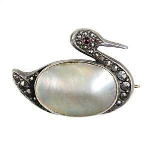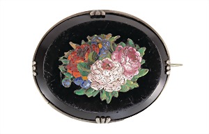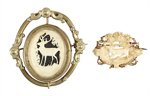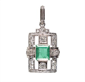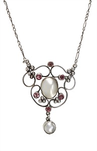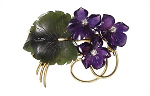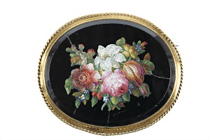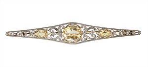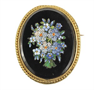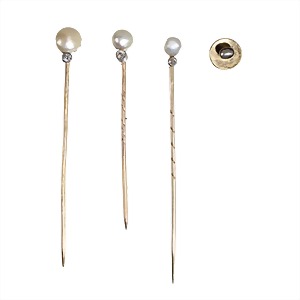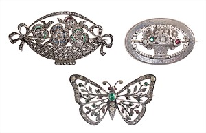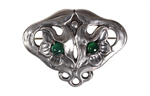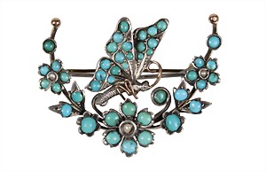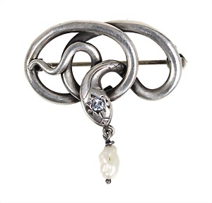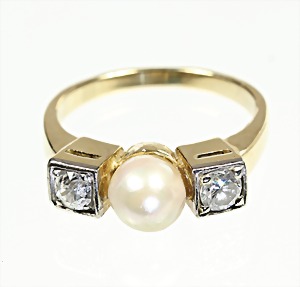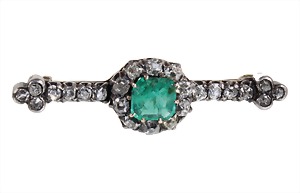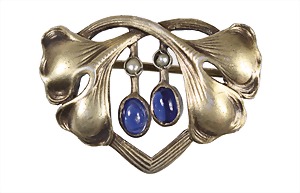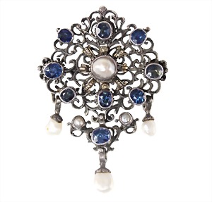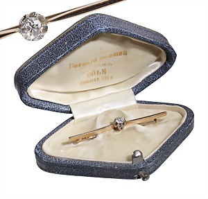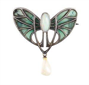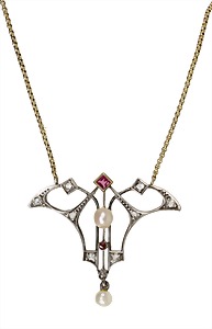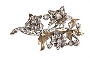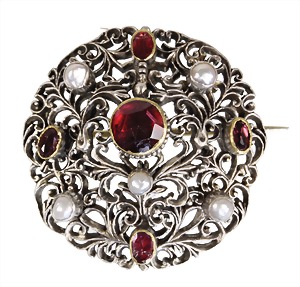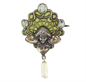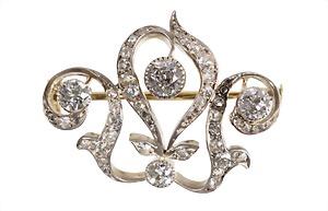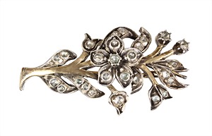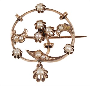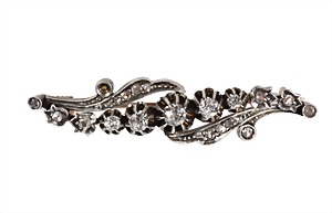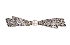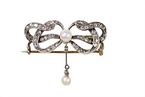 Brosche, JUGENDSTIL um 1900/10, Platin, GG 585/000, sig. GN, zentraler Altschliffdiamant ca. 0,4 ct weiß mit seitlichem Einschluss, 35 weitere Altschliffdiamanten u. 14 Diamantrosen, zusammen ca. 0,6 ct weiß/leicht getönt, alle Steine in Platin gefasst, feine Millgrifflinien, abgehängte Perle (wohl später ersetzt !), Brosche in Platin gearbeitet, rückseitige Broschierung in GG 585/000 (abnehmbar/verschraubt), ca. 30,0 x 33,0 mm, kl. Druckstelle