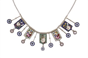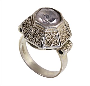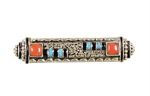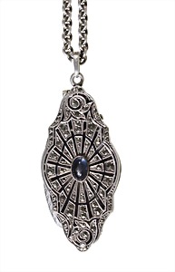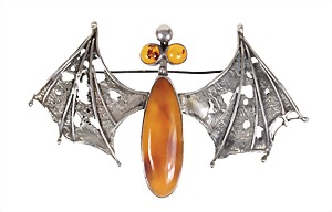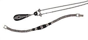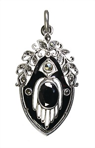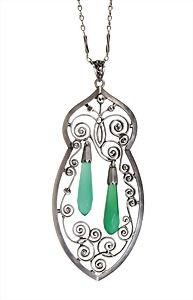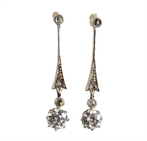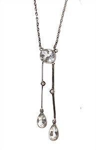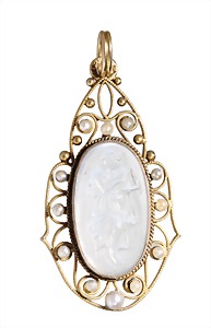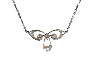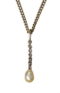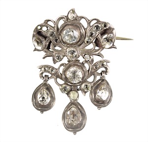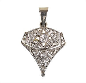brooch, art nouveau around 1900/10, platinum, yellow gold 585/000, signed GN, central old-cut diamond c. 0.4 ct white with inclusions at the side, 35 more old-cut diamonds and 14 rose cut diamonds, together c. 0.6 ct white/slightly toned, all stones set in platinum, fine Milgrain lines, hanging pearl (probably afterwards replaced !), brooch worked in platinum, brooch element on the back in yellow gold 585/000 (removable/screwed), c. 30.0 x 33.0 mm, small tender spot