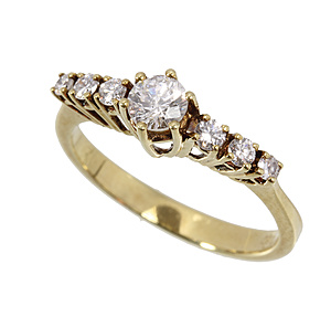 ring, yellow gold 585/000, 1 central brilliant (diameter = 4.4 mm), 6 more brilliants on the side, c. 0.60 ct (engraved) tw-vvsi/vsi, ring width c. 55
