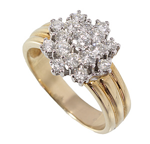ring, yellow gold/white gold 585/000 (tested), 17 brilliants c. 1.0 ct tw-vsi (white set), ring head diameter = 13.2 mm, ring width c. 58.5, total 6.7 g