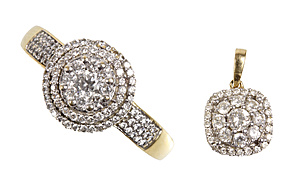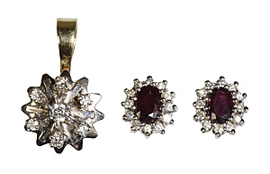 lot: white gold 585/000, a pair of ruby ear studs, 24 pieces octagon diamonds, c. 8.7 x 9.7 mm, 1 pendant, yellow gold/white gold 585/000 (tested), 7 brilliants c. 0.18 ct w-si, height = 20.8 mm, total 4.4 g