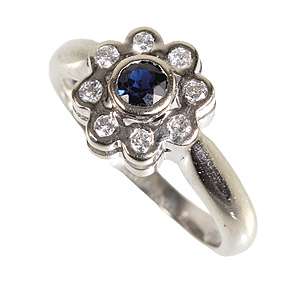 ring, white gold 585/00, central sapphire c. 0.22 ct (faceted), in a wreath 8 brilliants c. 0.08 ct tw/w-si, ring width c. 53