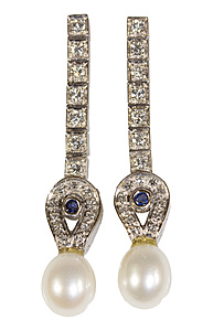 a pair of pearl ear pendants, white gold 750/000, 14 brilliants c. 0.56 ct tw-vsi, 22 pieces 8/8 cut diamonds white, 2 small sapphires (faceted), 2 freshwater pearls, height = 42.0 mm, total 9.1 g