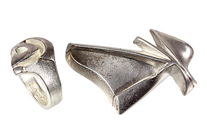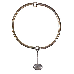 Futuristischer Anhänger von GEORG JENSEN aus den 1960er Jahren, Silber 925/000, sig. GEORG JENSEN 301 TORUN, H = ca. 60,0 mm. Entworfen von Vivianna Torun Bülow-Hübe, dazu 1 Halsreif von AARKKA Finnland, Silber 925/000, D = ca. 11 x 12 cm, total 52,9 g
