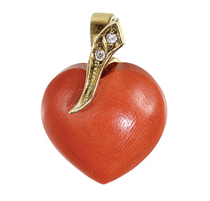 Anhänger, GG 585/000, Korallen-Herz, 2 Brillanten weiß, H = 21,3 mm, total 3,0 g Für diesen Artikel ist ein Versand in nicht EU-Länder leider nicht möglich !