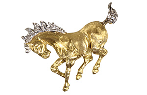 VINTAGE, Pferde-Brosche aus den 1970er Jahren, GG 750/000, sig. F.RO, vollplastisch ausgearbeitetes Pferd, sattinierte Oberfläche, Mähne u. Schweif weiß abgesetzt und mit Diamanten ausgefasst, ca. 45,0 x 33,0 mm, total14,8 g