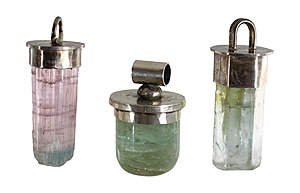 lot pendant: silver 925/000, 1 aquamarine-crystal, total 19,.9 g, 1 tourmaline-crystal, total 15.0 g, both with a height of = 45.6 mm, 1 compact circular pendant, beryl ? height = 34.6 mm