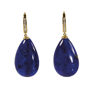 ear pendants, yellow gold 750/000, 2 lapis lazuli drops, 24 diamonds with baguette-cut c. tw-vvsi, height = 38.0 mm