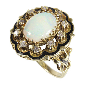 ring, yellow gold 585/000, central opal c. 3.5 ct (13.0 x 10.0 mm), in the wreath 10 brilliants c. 0.30 ct w-si/p, delicate, black enamel insert, ring head (c. 21.6 x 22.2 mm) airy constructed, at the side with decorative elements, ring width c. 55, total 10.3 g