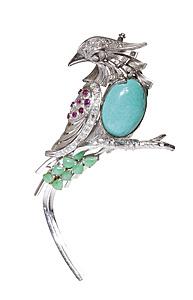 decorative brooch, bird on a branch, 1970s, white gold 585/000, decorative turquoise cabochon, c. 20.0 x 14.3 mm, 39 pieces 8/8 cut diamonds white, 8 rubies (faceted) c. 0.35 ct and 8 jade stones drop shaped, plastic worked bird , textured surface, doubel needle, mounting for a necklace, c. 86.5 x 46.0 mm, total c. 21.8 g