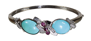 bracelet, white gold 585/000, turquoise cabochon, 3 rubies (faceted) c. 0,40 ct, 16 brilliants c. 0,33 ct, width = c. 15.0 mm, box clasp with safety catch, inside c. 59.2 x 52.5 mm, total c. 27.6 g