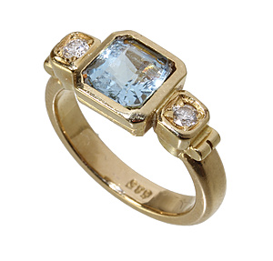 ring, yellow gold 585/000, central aquamarine c. 1.0 ct (octagonal, c. 6.0 x 6.0 mm), 2 brilliants c. 0.10 ct tw-vsi/si, ring width c. 48