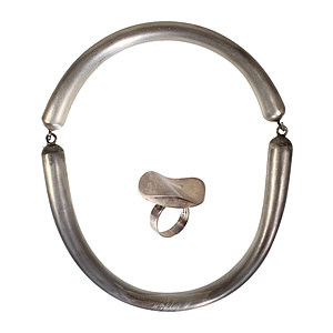lot: silver jewelry by AARIKKA FINNLAND from the 1960s, 1 ring silver 925/000, N° 34/100, decorative wavy ring head diameter = c. 33.5 mm, ring width c. 59, 1 unusual necklace N°17/100, 12.5 mm thick seamless hinge is bend to an elegant shape, inside: c. 11.0 x 13.5 cm (c. 40.0 cm), both signed AARIKKA FINNLAND, total 144.7 g