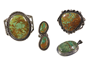 lot: 4 jewelry set with turquoises, native America/Navajo ?, silver, signed among others BP and NN, 1 bracelet/bangle, width = 71.6 mm, 1 bracelet/bangle, width = 62.0 mm, 1 pendant, height = 63.0 mm, 1 ring, ring head c. 25.0 x 66.5 mm, ring width c. 61, total c. 245 g