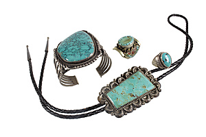 Lot: 4 Schmuckstücke mit Türkisen besetzt, native Amerika/Navajo ?, Silber, 1 Armreif/Spange, B = 60,0 mm; 1 Schieber an Lederschnur, Schieber ca. 45,6 x 69,5 mm; 1 Ring, Ringkopf B = 32,8, RW ca. 62; 1 Ring, RW ca. 56,5, total ca. 155 g