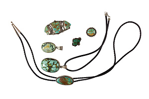 lot: 6 jewelry set with turquoises, native America/Navajo ?, silver, 1 bracelet/bangle, width = 34.7 mm, 1 slide at leather lace slide c. 30.0 x 53.0 mm, 2 rings, ring width c. 61 and 64, 1 pendant height = 61.0 mm, 1 pendant at caoutchouc ribbon, height = 76.7 mm total c. 226 g
