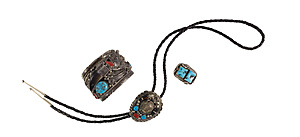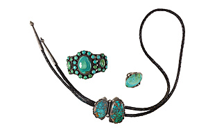 Lot: 3 Schmuckstücke mit Türkisen besetzt, native Amerika/Navajo ?, Silber, 1 Armreif/Spange, B = 47,0 mm; 1 Schieber an Lederschnur, Schieber ca. 52,2 x 63,2 mm; 1 Ring, Ringkopf ca. 23,0 x 35,7 mm, RW ca. 63,5, total ca. 211 g