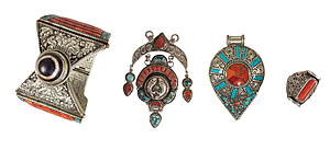 lot: 4 jewelry, Nepal/Tibet, silver, jewelry set with corals and turquoises, 1 bangle, eye pearl, width = 56.5 mm, inside c. 61.0 x 48.6 mm, box clasp, 2 pendants, 1 ring, ring width c. 60.5, unfortunately this item can't be shipped to non-EU countries! !