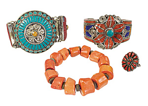 Lot: 4 Schmuckstücke, Asien (Nepal/Tibet ?), Silber, Schmuck besetzt mit Koralle u. Türkisen, teilweise mit Bernstein, 1 Armreif, in der Mitte dekorative Blüte, B = 48,5 mm, innen ca. 61,0 x 44,5 mm Armreif, Kreis mit Türkisen besetzt, D = 57,5 mm; 1 Korallenband auf Gummiband; 1 Ring, RW ca. 54, total 382 g. Für diesen Artikel ist ein Versand in nicht EU-Länder leider nicht möglich !