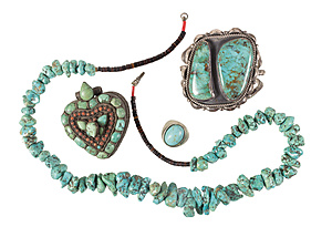 Lot: 6 Schmuckstücke mit Türkisen besetzt, native Amerika/Navajo ?, Silber, 1 Armreif/Spange, B = 34,7 mm; 1 Schieber an Lederschnur Schieber ca. 30,0 x 53,0 mm; 2 Ringe, RW ca. 61 u. 64, 1 Anhänger H = 61,0 mm; 1 Anhänger an Kautschukband, H = 76,7 mm total ca. 226 g