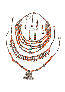 lot: 6 pieces, old ethnologic coral jewelry, silver, 2 multi-row necklaces, length = c. 42.0 cm, 1 necklace with integrated pendant, 3 pairs of ear pendants coral/turquoise, total 290 g, unfortunately this item can't be shipped to non-EU countries!