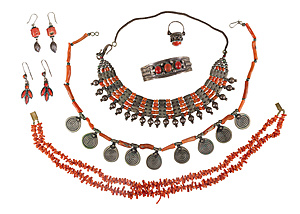 lot: 7 pieces, old ethnologic coral jewelry, mainly Africa (Morocco/Yemen), silver, 1 multi-row necklace, length = c. 43.0 cm, 1 necklace with hanging spirals, 1 ring, 1 bangle, inside c. 57.5 x 46.0 mm, 2 pairs of ear pendants coral, total 257 g, unfortunately this item can't be shipped to non-EU countries!