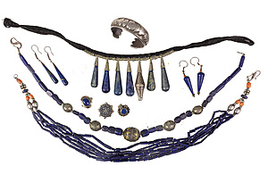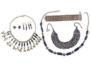 lot: 8 pieces, old jewelry from Afghanistan/Middle East, silver, 2 necklace with lapis lazuli, 1 necklace with hanging parts set lapis lazuli, length = 43.0 cm (elements tombac?), 1 bracelet, width = 29.0 mm, length = 18.0 cm, 2 rings ring width c. 51 and 54, 2 pairs of ear pendants, total 406 g
